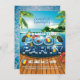 These tropical, graduation pool party invitations are sure to get the summer party rolling! Templates, including a photo template on back. Tropical palm trees and a beach island at top, realistic pool splashes and pool speakers, beach balls, and yellow ducks with excellent typography.