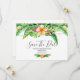 A beautiful watercolor painted floral design featuring tropical monstera leaves across which pretty faux glowing string lights appear behind a pretty yellow and pink frangipani flower. The greenery hugs the top edge of the card and a small bouquet with green foliage and a single frangipani appears at the bottom, which is repeated on the back. Personalise the templates to suit your special celebration.