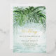 This watercolor tropical greenery wedding invitation features lush tropical palm leaves on a watercolor abstract ocean background, with REAL GOLD FOIL text accents for added luxury.