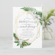Tropical leaves and white magnolias holy communion invite with gold geometric frame and elegant handwriting typography.
