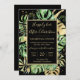 This elegant tropical elopement reception invitation features green and gold palm, philodendron, and fern leaves on a black background. An elegant gold frame highlights the gold text. Gold splatters accentuate this exotic botanical design and brings a bit of modern whimsy to the invitation. "Happily Ever After Celebration" along with the bride and groom's names are featured at the top. Wedding vow details and reception location and date are detailed underneath. RSVP information is on the back of the invitation.