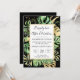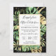 This elegant tropical elopement reception invitation features green and gold palm, philodendron, and fern leaves on a black background. An elegant gold frame highlights the black text. Gold splatters accentuate this exotic botanical design and brings a bit of modern whimsy to the invitation. "Happily Ever After Celebration" along with the bride and groom's names are featured at the top. Wedding vow details and reception location and date are detailed underneath. RSVP information is on the back of the invitation.