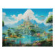 Lime green lush earth view on an island with a magical castle surrounded by waterfalls