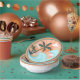 Simple beachy looking paper plates with fun colourful retro Illustration image of green palm trees, blue waves, orange sun, and yellow and pink sunrays. Surrounded by words related to summertimes... Waves, Beach Parties, Good Vibes, Cocktails, Summer, Friends, Laughter, Sun and Surf. Really cool plates for use during bbq beach of backyard parties and to have in stock at your patio or poolside tiki bar.