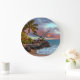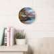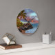 Beautiful tropical Hawaiian style island with soft sandy beach, and lush palms with a remarkable sunset! The sky and clouds glow in brilliant hues of pink, orange, and blue as the sun sets on the horizon. The foamy tropical sea water washes over the sandy beach, which is surrounded by sharp black eroded beachrock. Pick up one of these tropical Hawaiian island clocks today!