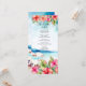 Celebrate your tropical paradise with the Tropical Beach Hibiscus Wedding Menu. This enchanting menu card features a picturesque beach scene complete with charming beach umbrellas, all rendered in a vibrant watercolor style. The tranquil blue waters and soft sandy shore set a relaxing tone, while vivid pink and red-orange hibiscus flowers add a splash of tropical elegance. This menu card beautifully complements your tropical-themed wedding and provides a stunning presentation for your wedding feast.