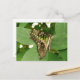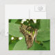 This stunning postcard features a photograph of a beautiful tropical butterfly. It has beautiful iridescent green markings all over its wings. It has its wings folded while it rests on some leaves. The photograph was taken using macro photography for a stunningly detailed result.