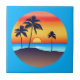 Ceramic tile in an image of a tropical island with palm trees, against an orange sunset and turquoise ocean