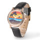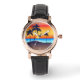 Watch in an image of a tropical island with palm trees, against an orange sunset and turquoise ocean