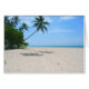 Photograph of a tropical island beach (Seychelles) with leaning palms, blue skies, turquoise water and warm sand.