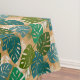 Tropical island foliage themed table cloth with palm fronds and broad jungle leaves.