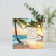 A blank invitation paper with an envelope rests on a sandy beach against the backdrop of gently swaying palm trees and a serene ocean under a vibrant sunset for a Save Our Date wedding destination.