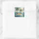 Tropical island with palm trees and a hammock hanging over sand, in a teacup floating on ocean waves, illuminated by sunlight
