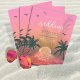 The mouth-watering colours of a summer fruit salad, from melon and peach through apricot and raspberry, give the pieces in this matching design set some of it's irresistible appeal... the beautiful island palm trees, palm fronds, delicate birds in the sky and giant sunrise over sparkling water easily provide the rest. The wedding invitation shown here features all of the above as well as a palm tree shadow on sand for a striking flip side. Search ID581 to see the matching products and other colour options for this design.