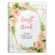 This beautiful and elegant bridal shower guest book features watercolor pink and orange hibiscus flowers and foliage on a gold geometric frame. The text combines handwritten script and serif fonts for a stylish and modern look. This is perfect for a summer tropical bridal shower.