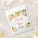 This beautiful and elegant wedding favor bag features watercolor pink and orange hibiscus flowers and foliage. The text combines handwritten script and serif fonts for a stylish and modern look. This is perfect for a summer tropical wedding.