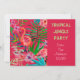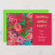 A colourful vibrant invitation suitable for a jungle themed or tropical island themed party. This design features a pink flamingo with palms, hibiscus and jungle plant foliage. Text and dark pink background colour is fully customisable.