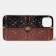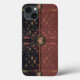 Old world European, exotic and dark, with a slight flavour of the Orient, the beautiful pattern by ZoeSPEAK, in natural colours on this iPhone 13 Case, was made from Zoe’s original photograph of wrought iron latticework and tropical print fabric. Palm fronds and other tropical leaves, in shades of pale greens, terracotta and beige, rest gracefully on a black background behind the latticework. The design is in the style of a clutch bag or purse, with a floral medallion button closure on a dark background, smooth fabric flap over a faded burgundy textured fabric of the same pattern. The flap is edged with a salmon pink grosgrain ribbon.