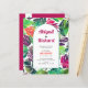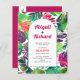 BUDGET Maximalist colourful tropical leaves and arch wedding invitation with QR code. Dive into a world filled with vivid colours and tropical energy with our affordable wedding invitation. Ideal for those who appreciate bold designs, this invitation showcases a beautiful array of tropical leaves in green, orange, purple, and magenta pink hues. The standout feature is the arch that surrounds your custom text in a striking font, drawing the eye in. Turn it over to find the couple's initials against a vibrant magenta backdrop and a QR code is included for convenient online RSVP.