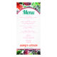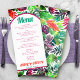 This wedding menu card is a stunning display of tropical leaves in a maximalist style design. The boho arch in white with a magenta border holds the word 'Menu' and the names of the couple in bold typography, while the upper and bottom parts behind the arch feature a colourful pattern of tropical leaves in green, magenta purple, and vibrant orange. The back of the card is also covered with the same colourful tropical pattern, making it a beautiful addition to any tropical or boho-themed wedding.
