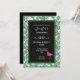 A birthday invitation with a green tropical leaves pattern and a black frame with a gold border layered over top. A pink flamingo illustration adds a touch of whimsy.