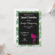 A party invitation with a green tropical leaves pattern and a black frame with a gold border layered over top. A pink flamingo illustration adds a touch of whimsy.