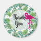 A thank you magnet with a green tropical leaves pattern and a pink flamingo illustration layered over top which adds a touch of whimsy.