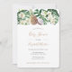 Lush Green foliage teamed with watercolor white orchids, pineapple and coconut combine for this jungle-inspired baby shower invitation design.