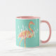 Tropical pink flamingo patterned in pineapples mug with a cute mint green background and the phrase "Let's Flamingle".