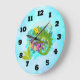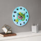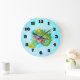 A clock with a cute illustration of a green tropical lizard surrounded by leaves and flowers with a turquoise blue color behind the image.
