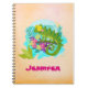 A spiral notebook with a cute illustration of a green tropical lizard surrounded by leaves and flowers on a turquoise blue colour.