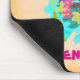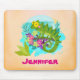 A personalised mouse pad with a cute illustration of a green tropical lizard surrounded by leaves and flowers on a turquoise blue colour.