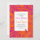 Tropical magenta, vibrant orange and gold monstera and palm leaves wedding invitation. It showcases a pattern of magenta fuchsia pink tropical leaves with gold outline and your text in a white frame on vibrant orange background. The back includes a gold polka dot pattern on magenta background.