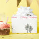 Tropical Beach Merry Christmas wrapping paper, with a palm trees illustration pattern and red script typography. With customisable lettering, you add your own information. A festive addition to your holiday destination gifts.