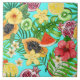 Tropical mix-fruit, flowers and leaves on blue ceramic tile