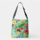 Tropical mix-fruit, flowers and leaves on blue crossbody bag