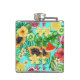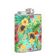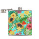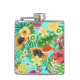 Tropical mix-fruit, flowers and leaves on blue hip flask