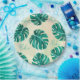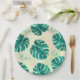 Big palm Hawaiian tropical leaves and aloha handwriting style script over a watercolor washed cream ivory background decorative paper plates for your summer beach parties.