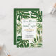 Tropical monstera and palm leaves green and gold engagement party invitation. It showcases a pattern of tropical leaves with gold outline on and your text in a white frame. The back includes a gold polka dot pattern.