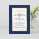 Invite your guests to help you celebrate your special day with this elegant tropical birthday invitation featuring modern script, navy blue and gold text including an artistic palm tree and metallic gold foil frame on the front of the card. A navy blue background is on the front and back.