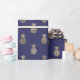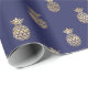 This wrapping paper features tropical faux gold foil pineapple pattern on navy blue background.