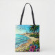 Aloha! Pretty tropical coastal shoreline. Pretty blue water, palm trees, tropical flowers and a lighthouse in the background. Ai art done in a comic book pop art style.