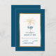 Provide your guests to reply to your wedding invitation with this elegant RSVP card featuring modern script, ocean blue and gold text including an artistic palm tree and metallic gold frame on the front of the card. A coordinating ocean blue background is on the front and back.
