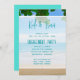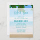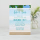 Tropical themed, wedding engagement, or shower, invitation for the couple. The background is a tropical ocean view with beach sand and blue water. A white layer holds the turquoise text with modern script for the names of the couple at the top. Include registry and other info at the bottom as needed.