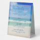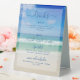 This beautiful beach wedding drinks menu table tent sign features a gorgeous photo of the ocean waves for a destination event. Pretty beach photography paired with elegant white and blue typography creates a chic, modern bar menu for your tropical island party or coastal luau.