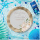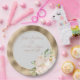This romantic floral wedding plate features a gold texture design, with watercolor tropical flowers. A delicate bouquet of blush coloured orchids and plumeria flowers is pictured on the right. Sample names of the newlywed couple and wedding date are printed in the centre.