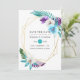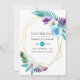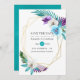 Watercolor turquoise and purple tropical leaves and orchids wedding save the date cards with a gold geometric frame customisable to your event specifics.