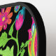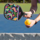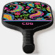 This pickleball paddle features a bright and colourful pattern of paisleys and flowers, along with your monogram in hot pink. The turquoise, lime green, pink, and gold colours brighten up the swirls and organic florals. A pink glittery border, trimmed in blue, sets off the black colorblock and right custom pink initials. Make sure to type your initials in the Personalise section.