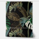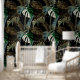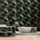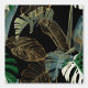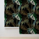 Tropical night vintage palm, banana, plant, golden leaves, floral seamless border black background. Exotic dark jungle wallpaper.