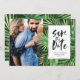 Modern tropical palm leaf watercolor foliage photo save the date cards. Hand painted script text. Part of a on trend summer collection. Background colour can be changed.